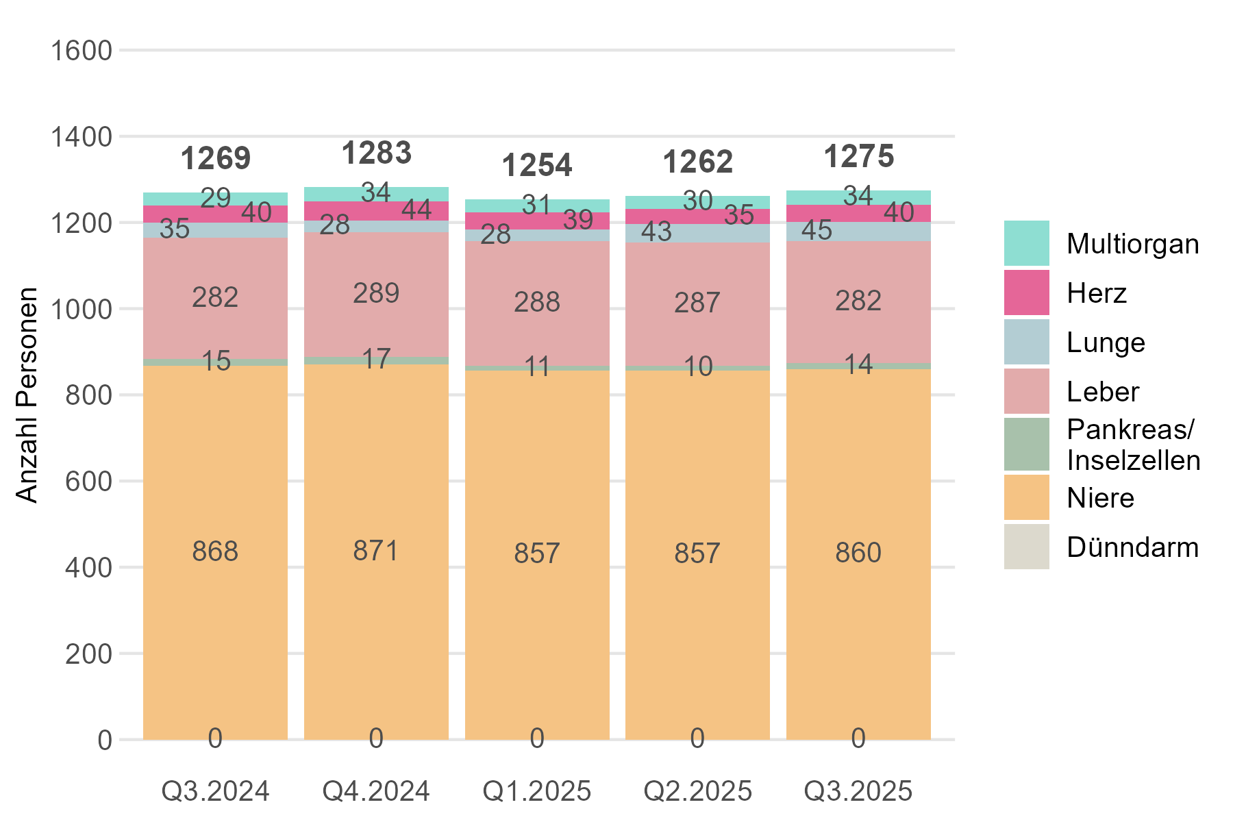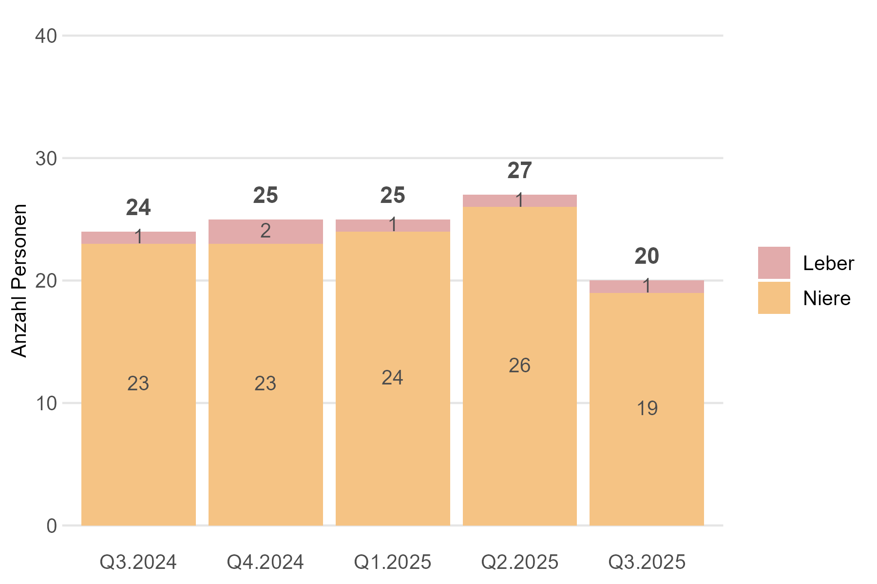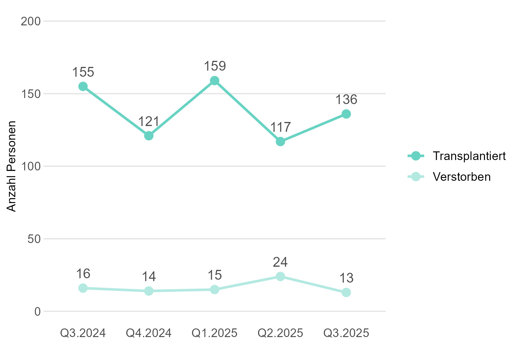 Ende September 2025 warteten in der Schweiz 1275 Personen auf eines oder mehrere Organe von spendenden verstorbenen Personen. Im Vergleich zu Ende Juni 2025 sind das 13 Personen mehr (+1 %). 13 Personen sind im dritten Quartal 2025 auf der Warteliste verstorben, das sind 11 weniger (-46 %) als im zweiten Quartal 2025.