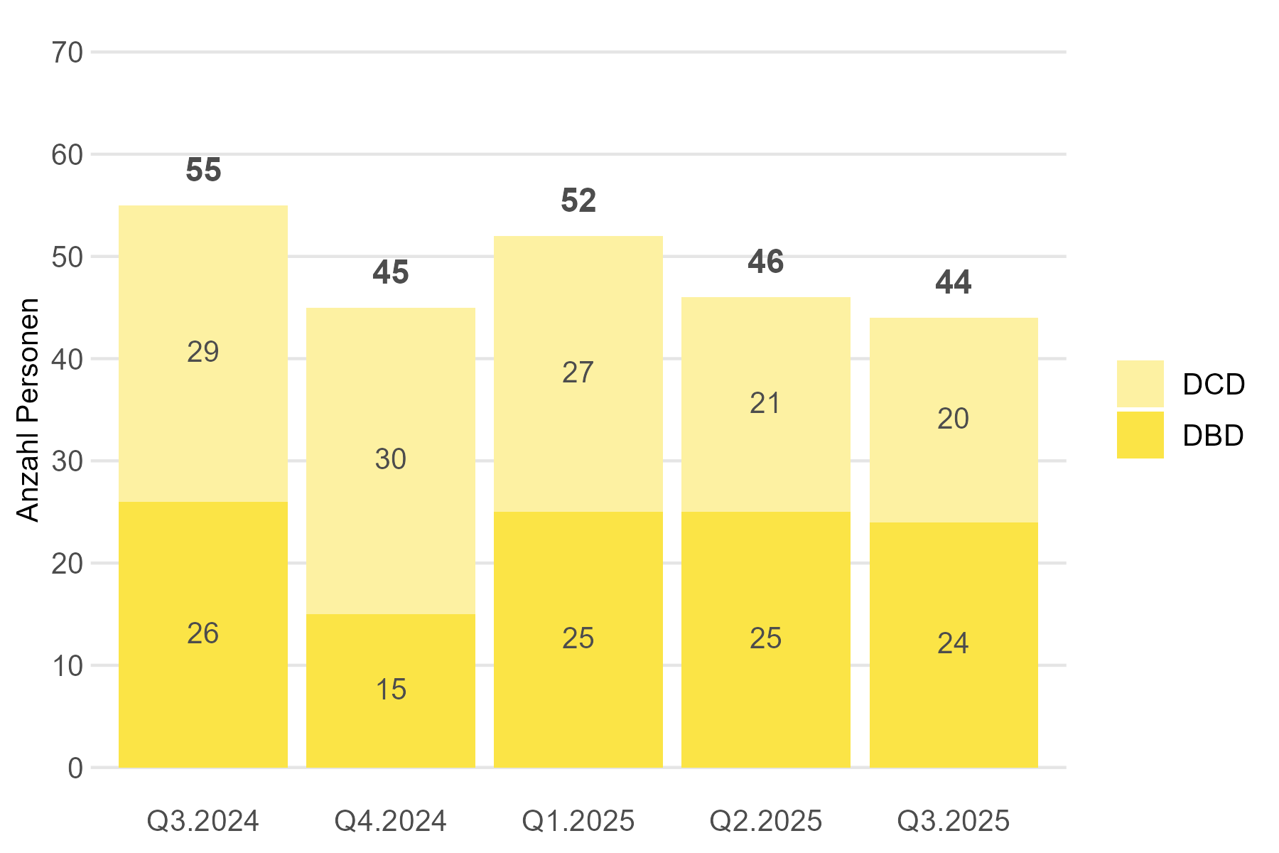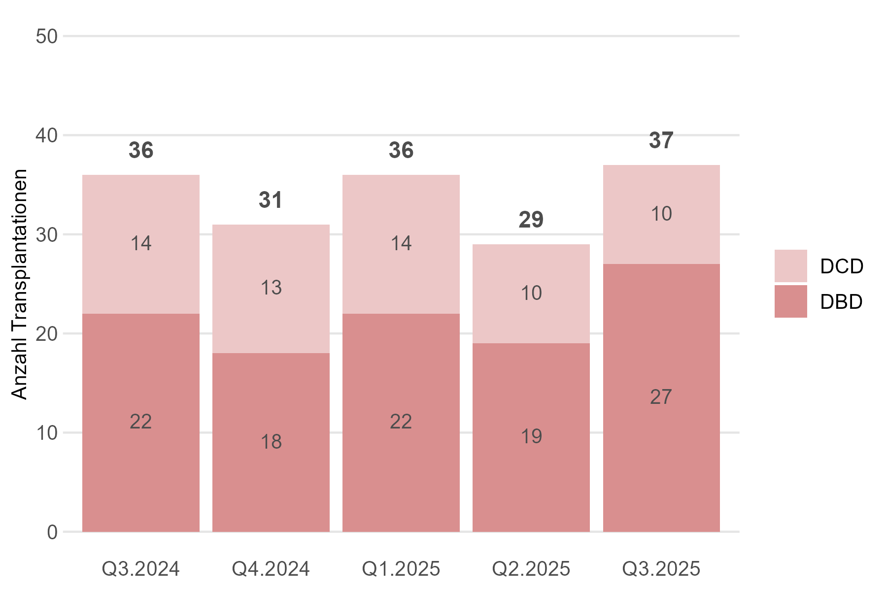 Im dritten Quartal 2025 haben in der Schweiz 44 Personen ihre Organe nach dem Tod gespendet. Im Vergleich zum Vorquartal sind das 2 Personen weniger (-4 %). Von den 44 Personen waren 20 (45 %) im Hirntod nach Herz-Kreislauf-Stillstand (DCD). 138 Organe von verstorbenen spendenden Personen wurden in der Schweiz transplantiert, das sind 16 mehr (+13 %) als im Vorquartal. Mit 2.7 Organen ist die durchschnittliche Anzahl transplantierter Organe pro spendende verstorbene Person gegenüber dem Vorquartal wieder leicht gestiegen.