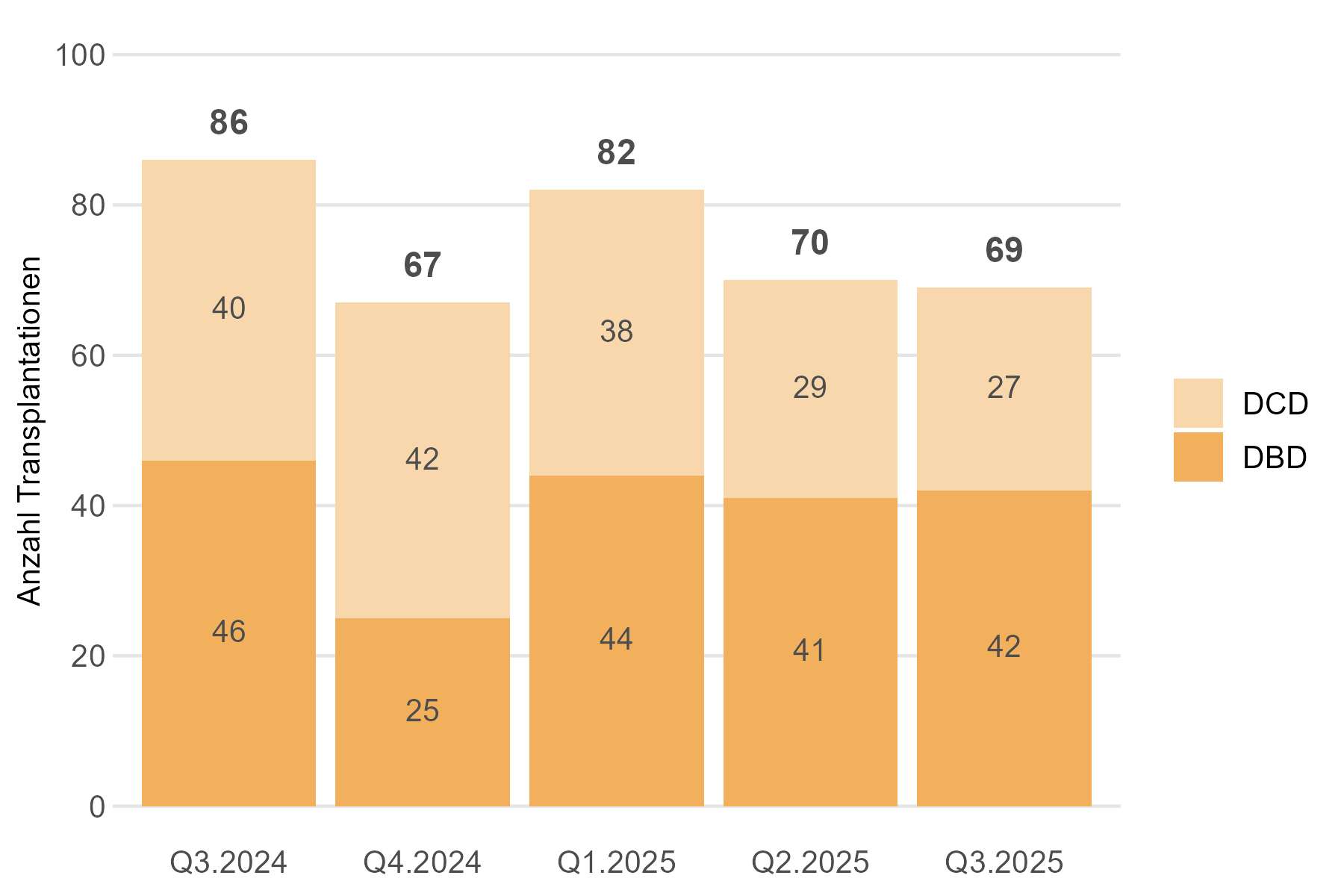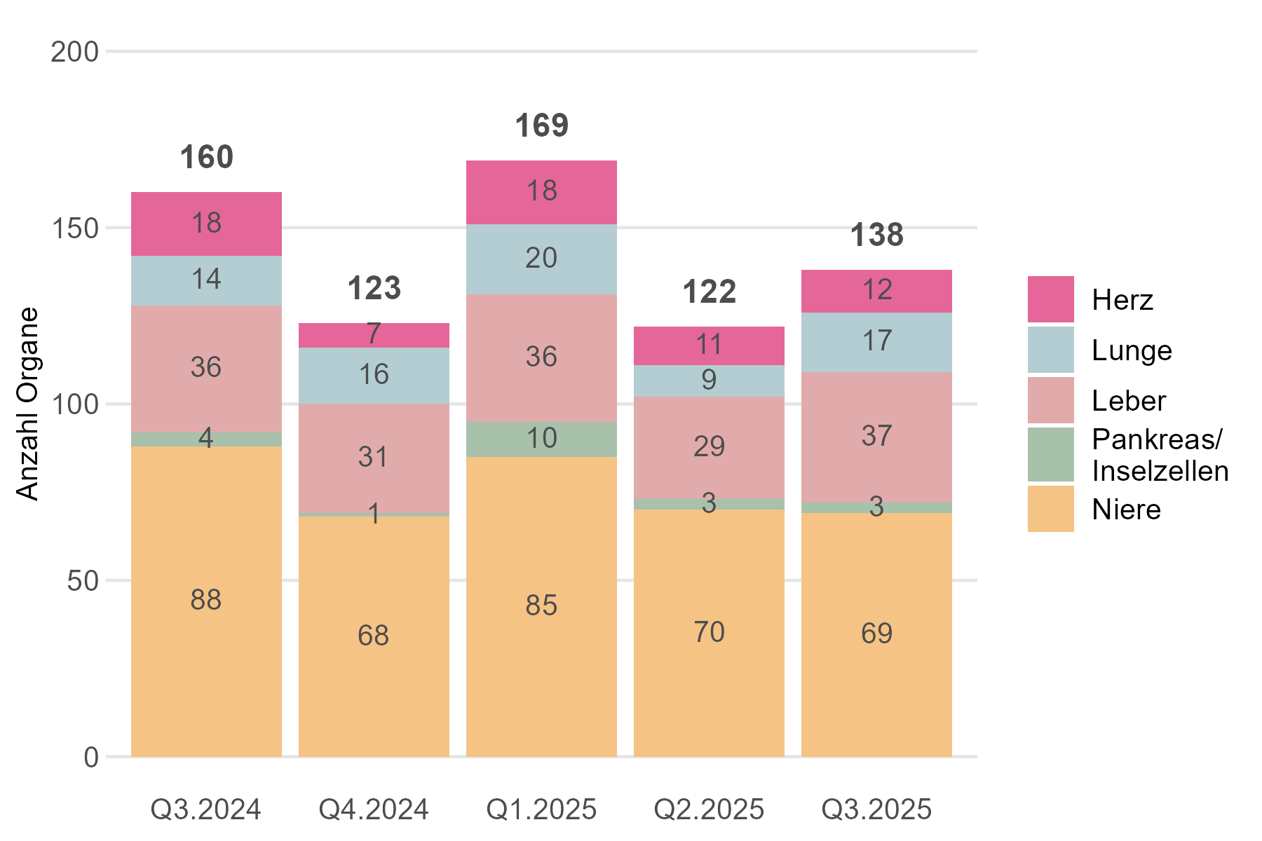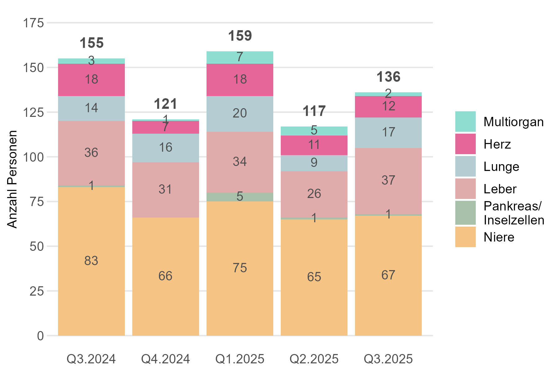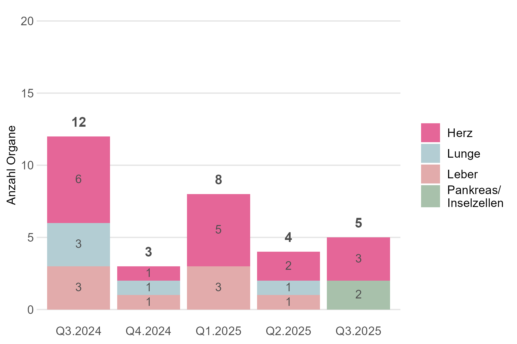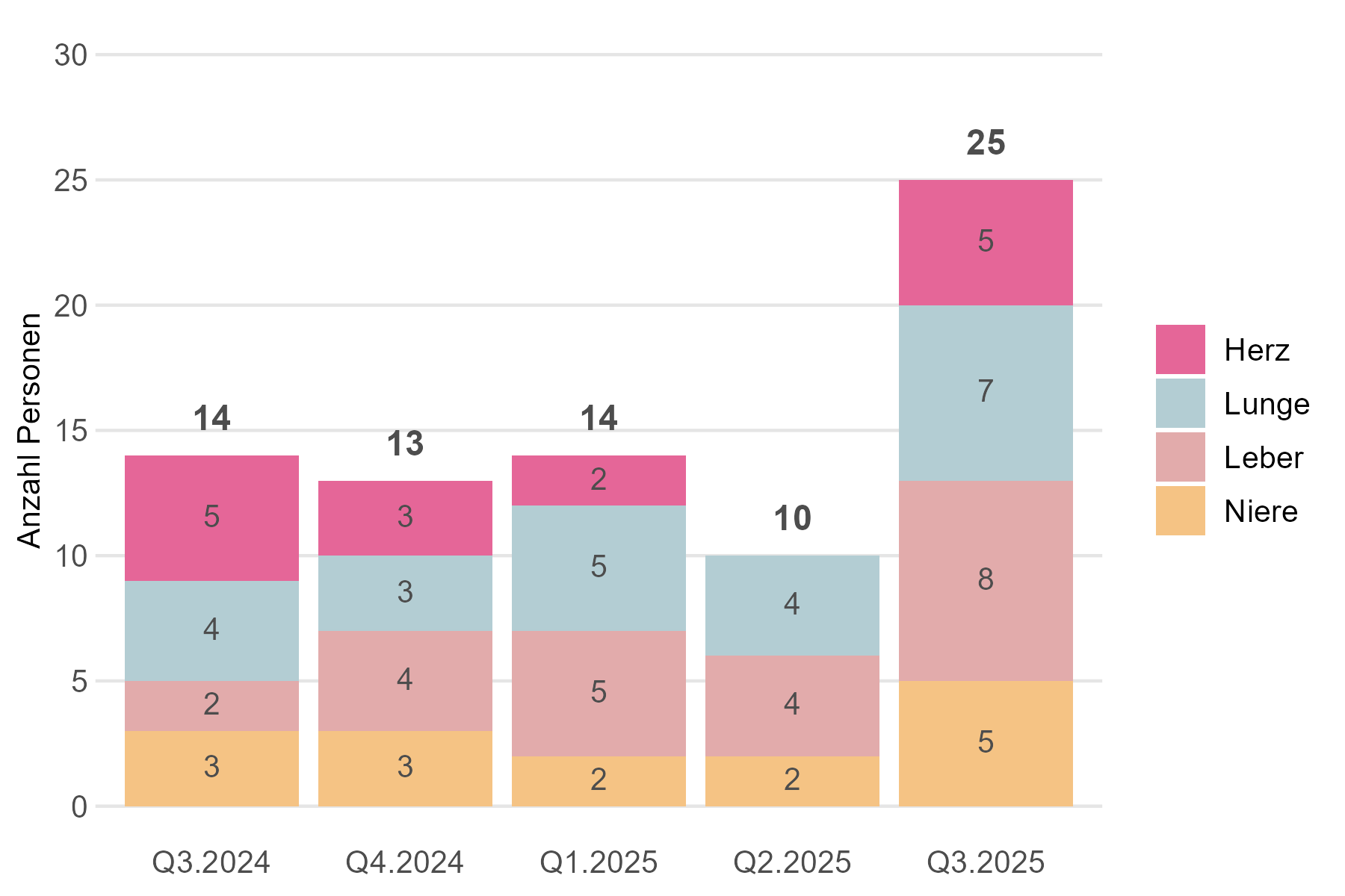 Im dritten Quartal 2025 erhielten in der Schweiz 136 Personen eines oder mehrere Organe von spendenen verstorbenen Personen. Im Vergleich zum zweiten Quartal 2025 sind das 19 Transplantationen mehr (+16 %). Insbesondere gab es im dritten Quartal mehr Lungen- und Lebertransplantationen. Von den 136 Personen erhielten 25 Personen (18 %) ein Organ aus dem Ausland. Noch nie konnten in einem Quartal so viele Personen in der Schweiz dank einem Organ aus dem Ausland transplantiert werden.