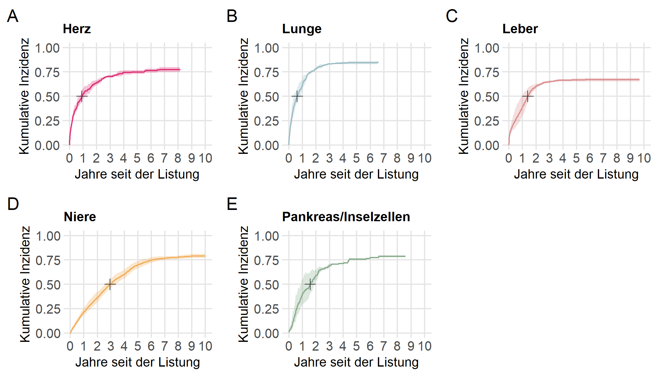 Abbildung 1: Kumulative Inzidenzkurven des Ereignisses Transplantation für die verschiedenen Organe A–E (mit 95 %-Konfidenzband). Die Kurven zeigen die Wahrscheinlichkeit, dass eine Person innerhalb eines bestimmten Zeitraums nach der Aufnahme auf die Warteliste transplantiert wird. Das Kreuz markiert die mediane Wartezeit bis zur Transplantation, d.h. die Wartezeit, nach der die Wahrscheinlichkeit einer Transplantation 50 % beträgt.