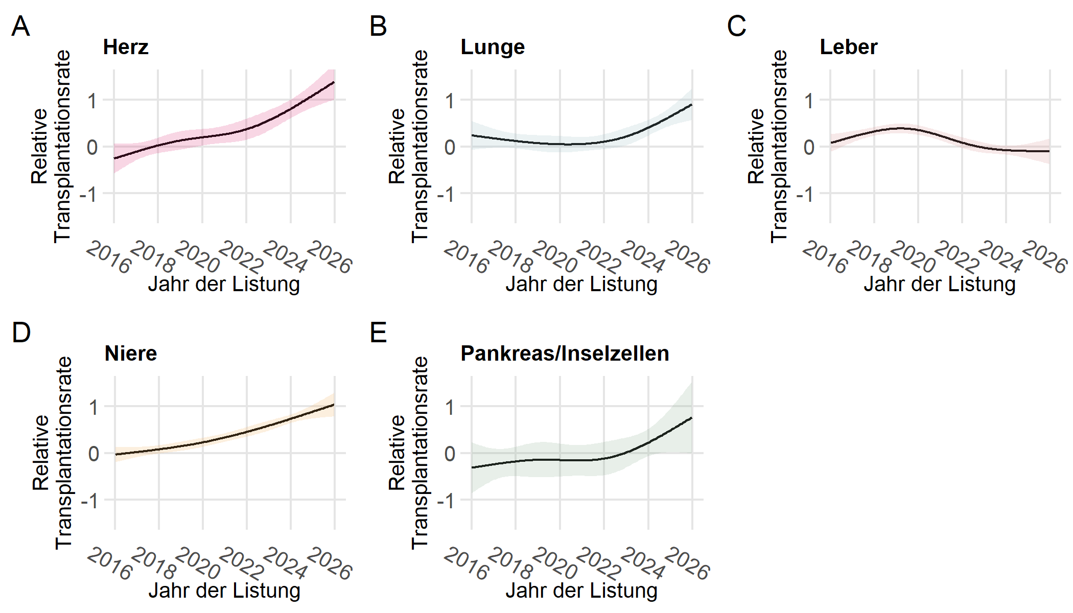 Abbildung 2: Entwicklung der Transplantationsrate in den letzten Jahren (mit 95 %-Konfidenzband). Bei Herz, Lunge, Niere, und Pankreas/Inselzellen ist ein Anstieg der Transplantationsrate zu verzeichnen, der sich günstig auf die Wartezeiten auswirkt.